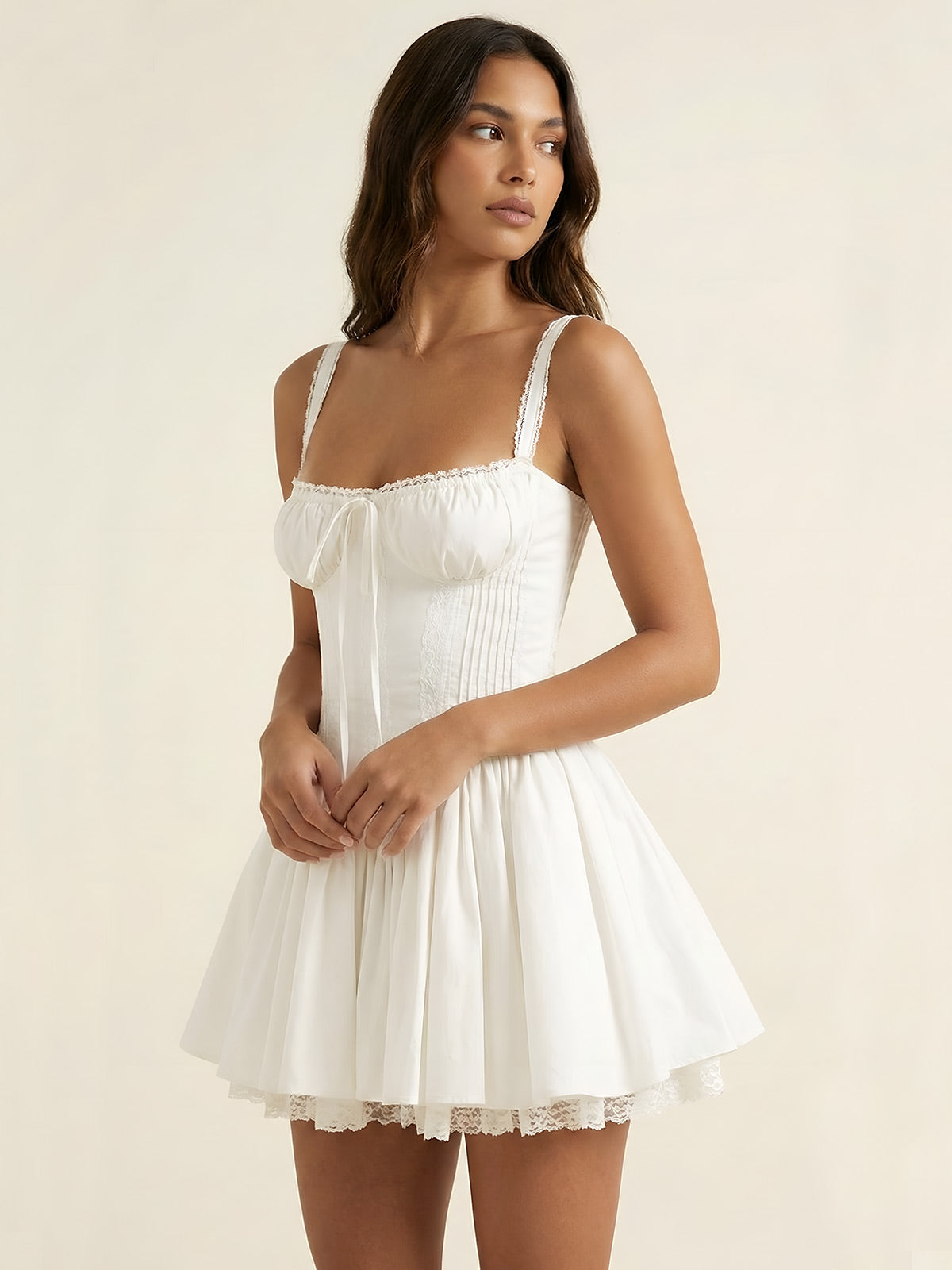 Elevate your summer wardrobe with this meticulously crafted Suninheart spaghetti strap dress. The A-line silhouette creates a flattering profile while the mini length and lace-up details add a sophisticated touch of allure. Expertly designed with premium materials, this versatile white dress transitions effortlessly from daytime holiday wear to evening parties, ensuring both comfort and elegance for any summer occasion.
