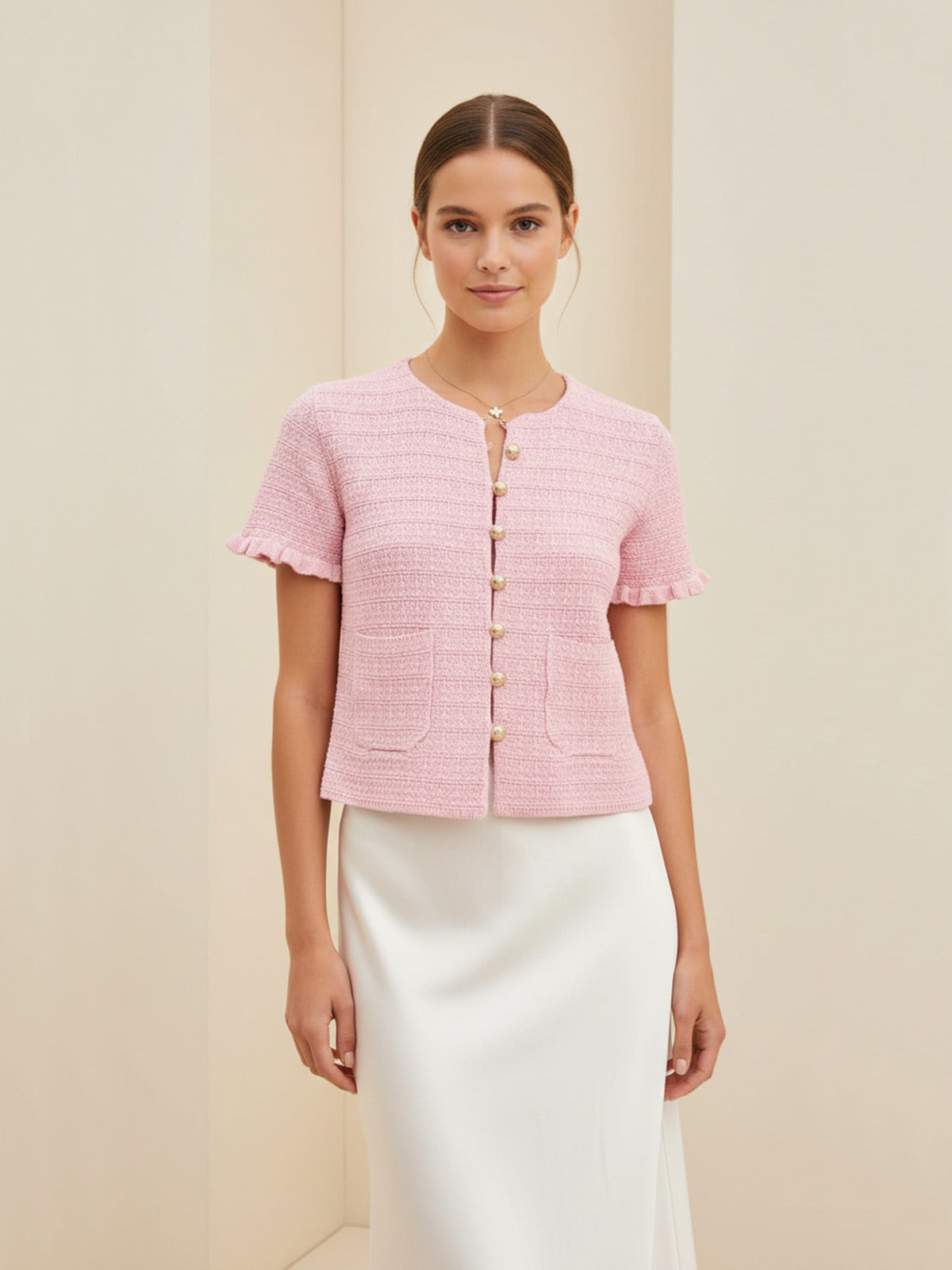 Discover refined elegance with this expertly crafted knitted cardigan, designed for the modern woman seeking versatile layering. Featuring a flattering cropped silhouette and delicate short sleeves, this piece seamlessly transitions from casual daywear to polished evening looks. The soft pink hue complements any wardrobe, while the quality knitwear construction ensures lasting comfort and durability. Perfect for layering over dresses or pairing with your favourite basics, this cardigan delivers timeless style with contemporary appeal.