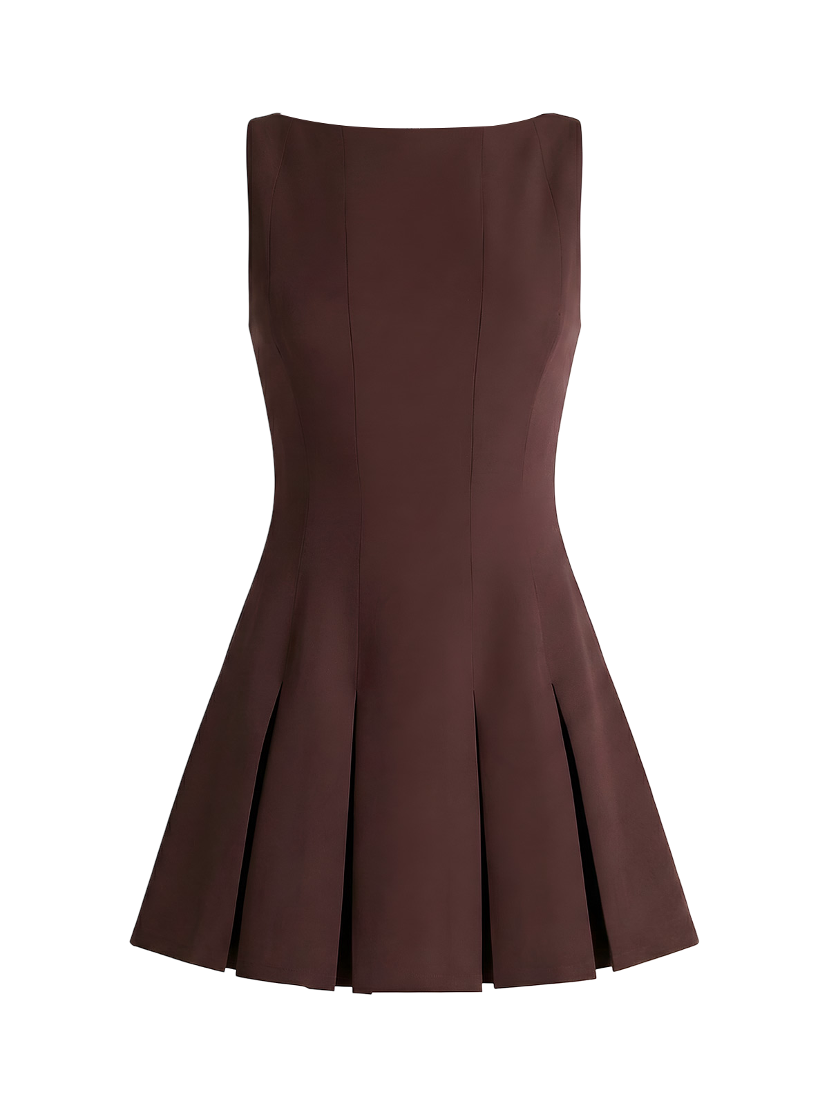 This vintage-inspired brown mini halter dress features a backless design and a pleated A-line hem, combining elegance with a modern silhouette. Sleeveless and lightweight, it is ideal for holiday parties and banquets, offering both comfort and style. Perfect for making a refined statement at any special occasion.