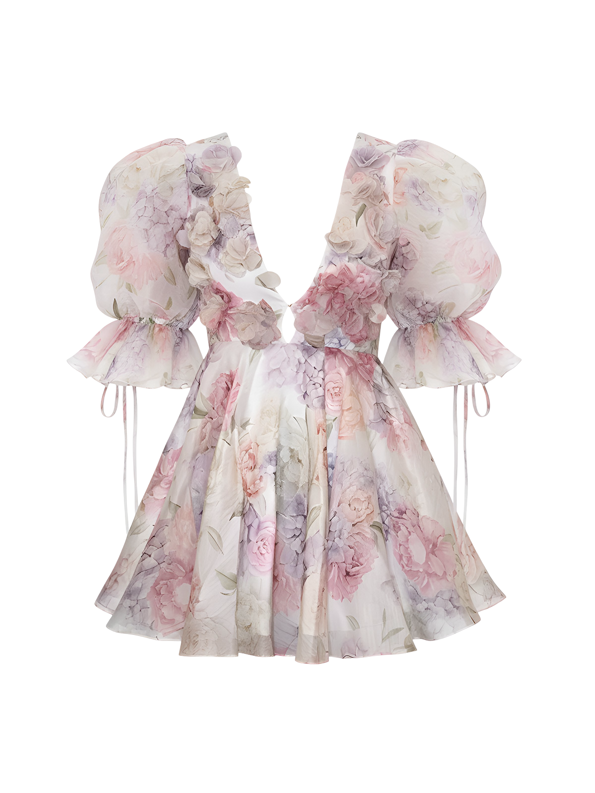 This elegant short dress features a delicate pink chiffon fabric adorned with 3D floral accents, creating a sophisticated and feminine look. The design includes dramatic puff sleeves and a flattering V-neckline, complemented by a high waist that enhances the silhouette. Its layered A-line skirt adds movement and grace, making it an ideal choice for special occasions or stylish daytime events. Crafted for both comfort and style, this dress offers a refined yet playful aesthetic for the modern woman.
