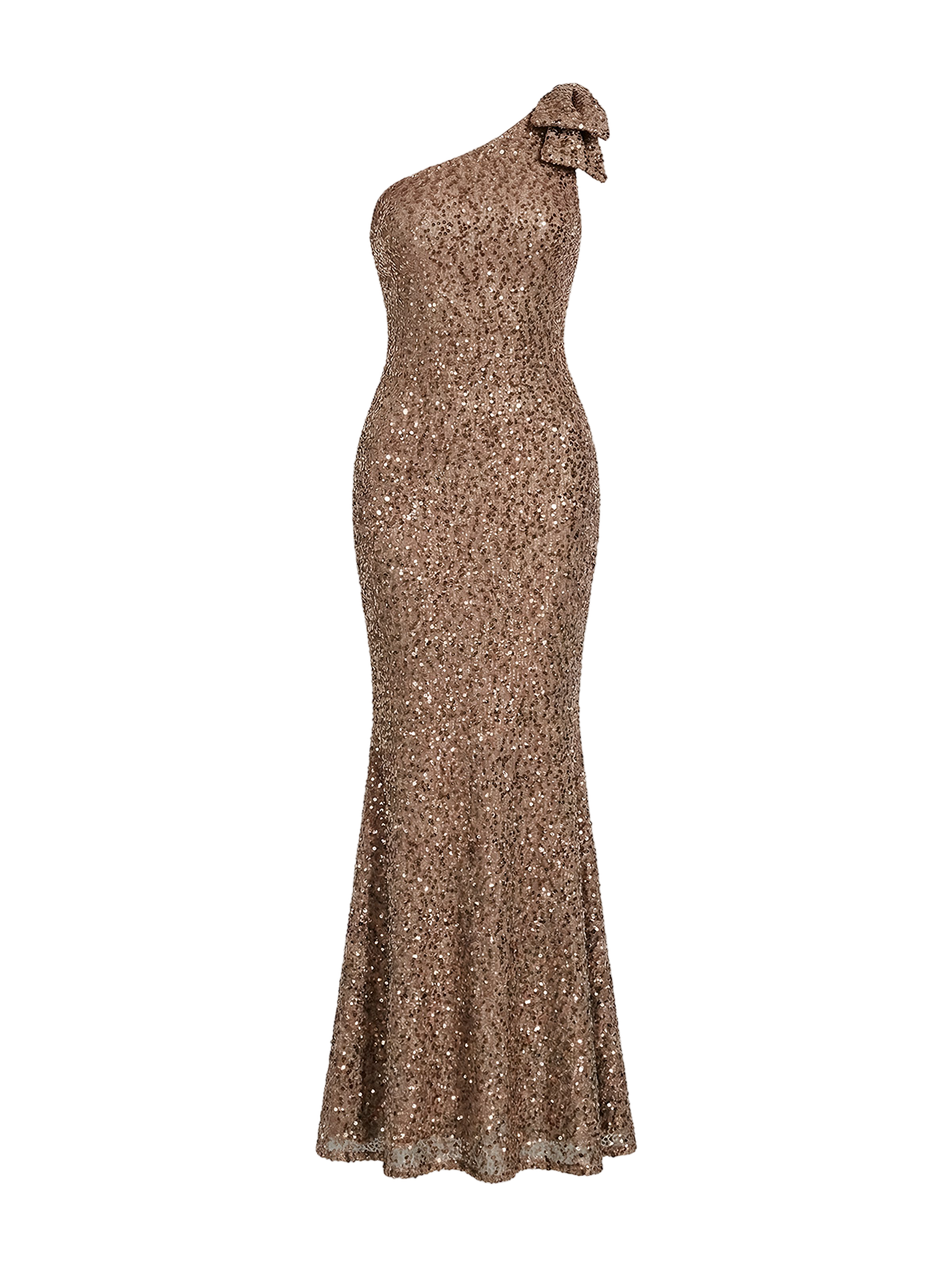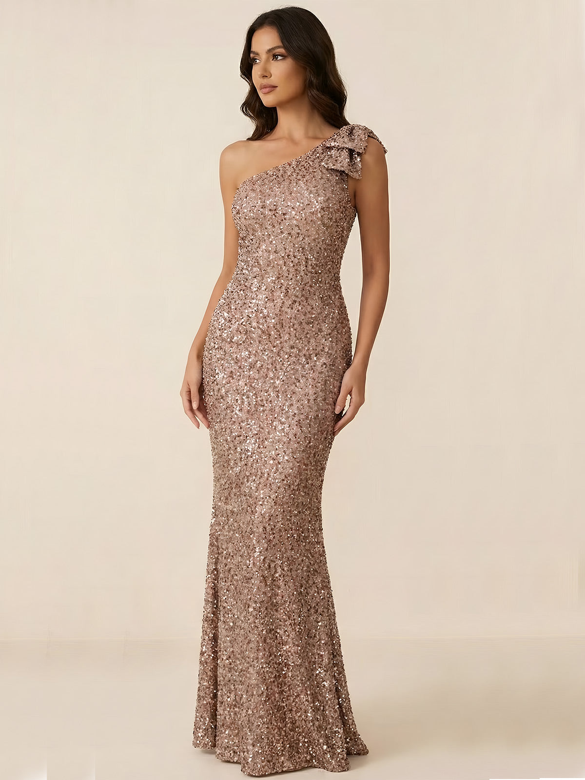 Stunning off-shoulder sequin dress designed for weddings and formal events. Features shimmering sequin detailing and a flattering slant shoulder cut that combines modern elegance with timeless appeal. Perfect for making a sophisticated statement at any special occasion.