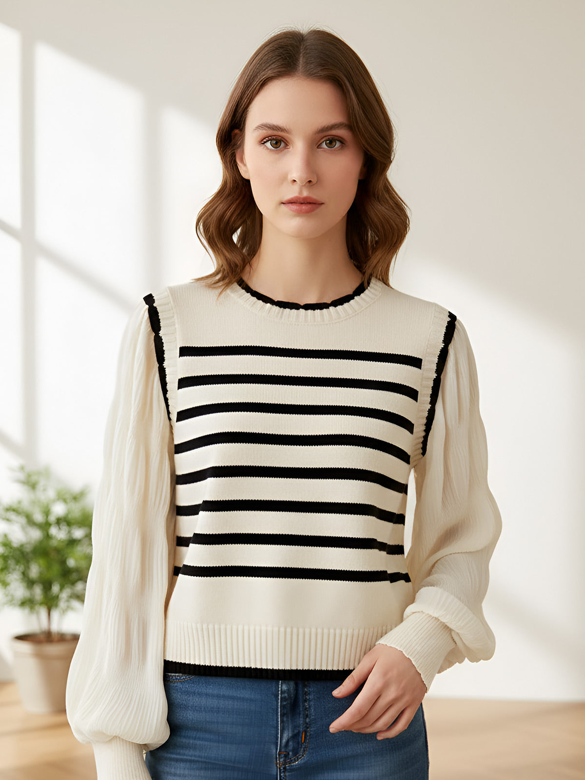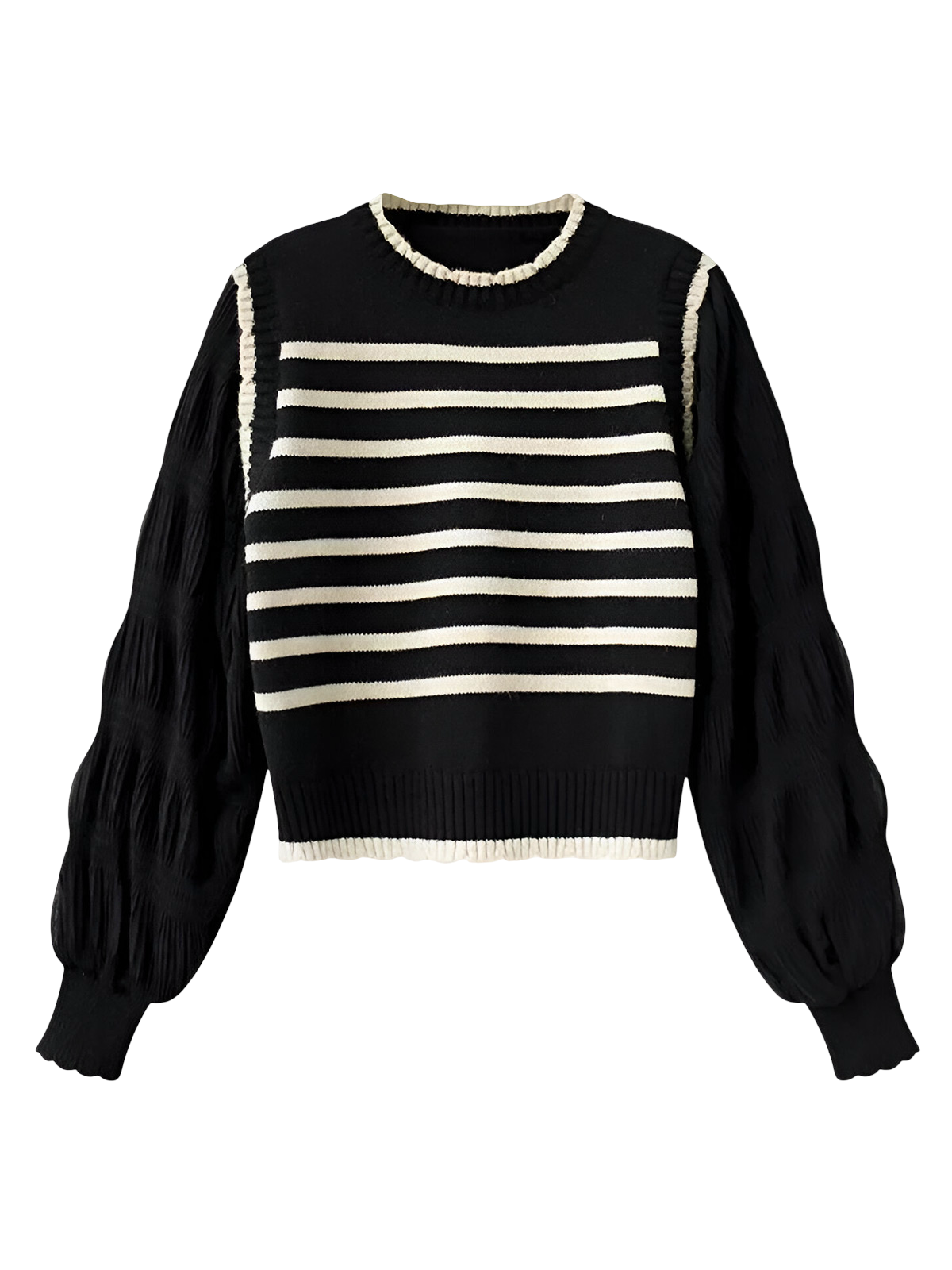Crafted from sumptuous knit fabric, this striking black and white striped pullover delivers sophisticated layering appeal with its clever faux two-piece design. The soft, fluid construction ensures comfort through spring and autumn transitions, while the Korean-inspired silhouette flatters with its relaxed yet refined proportions. An essential wardrobe piece that effortlessly elevates casual and smart-casual ensembles alike.