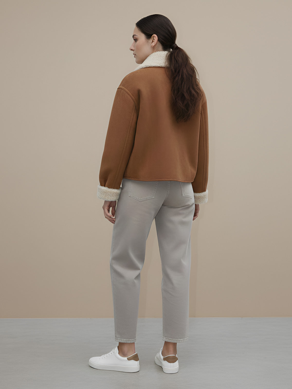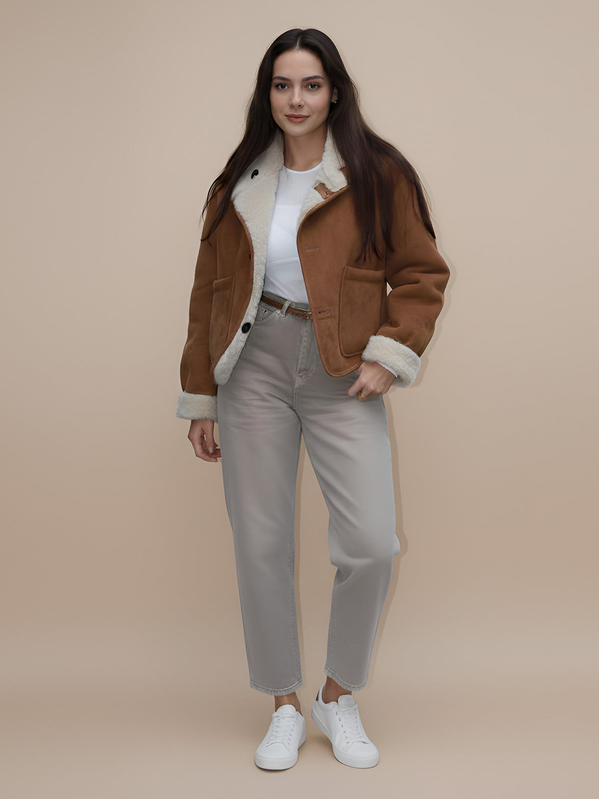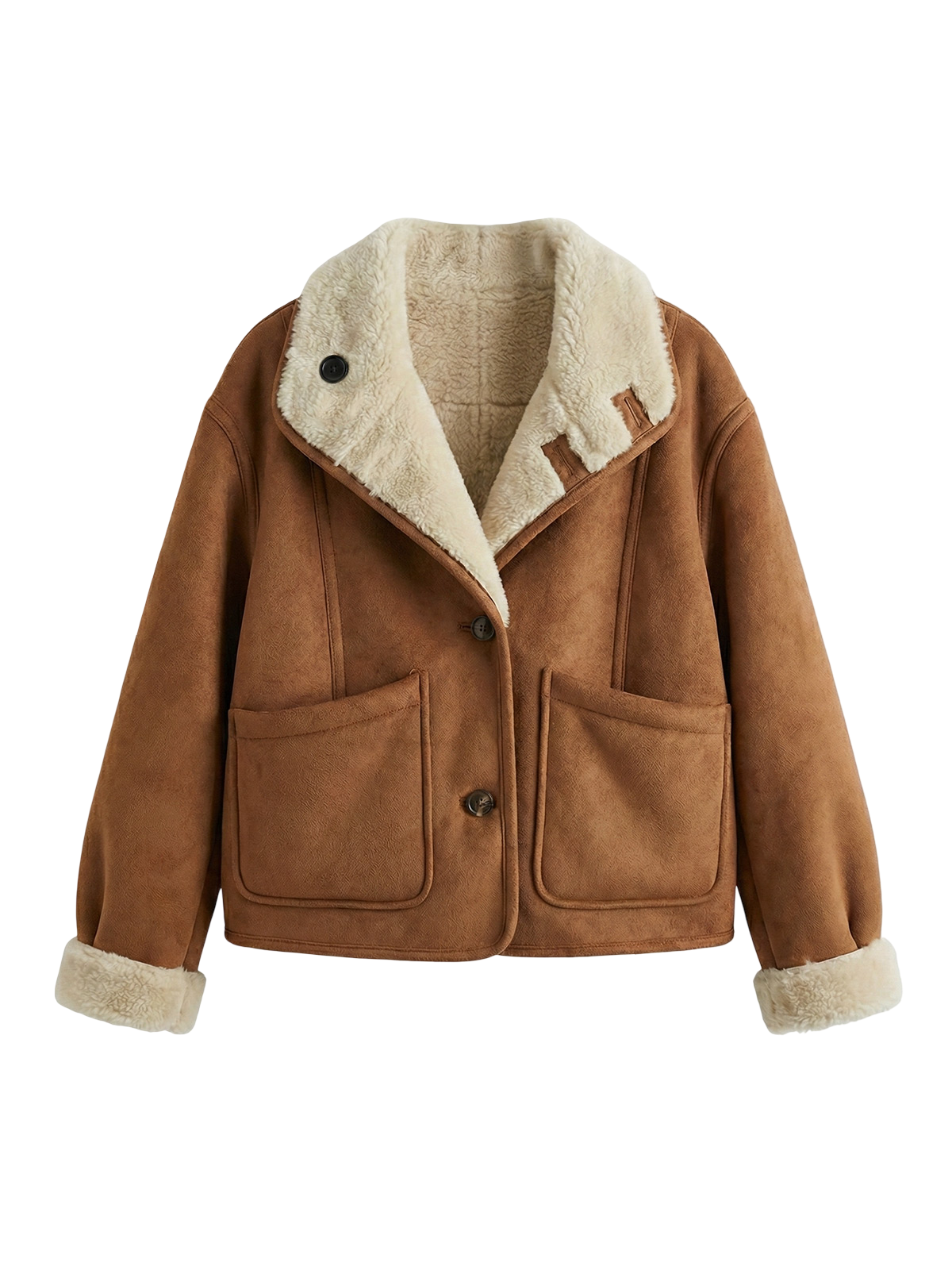 This reversible suede jacket offers two stylish looks in one coat. Featuring a stand collar, practical pockets, and premium suede construction, it transitions effortlessly from casual to elegant wear. The retro design provides warmth and lasting quality for winter, making it a versatile essential for any wardrobe.