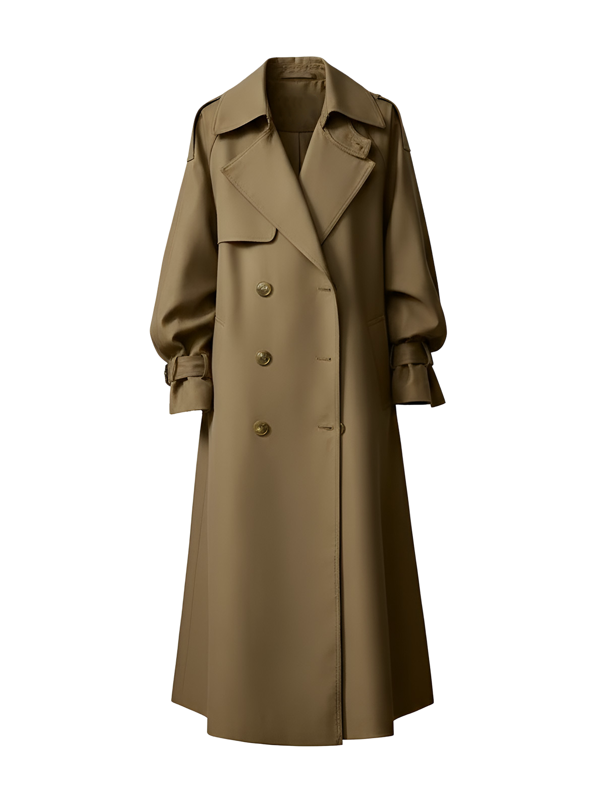 This khaki trench coat is a versatile essential for spring and autumn. Featuring a double-breasted design with a belt to cinch the waist, it offers a polished look for work or weekend wear. The quality fabric and timeless style make it a reliable wardrobe staple that pairs with almost everything.