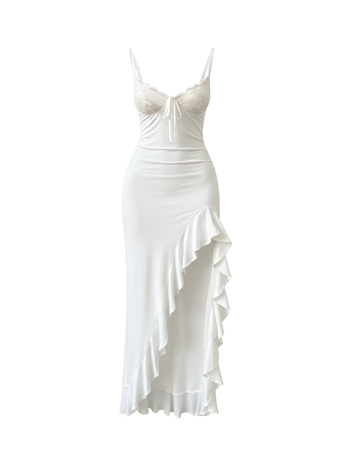 This lace maxi dress from VESSITA offers a sleek, sleeveless design with a V-neckline, ideal for warm evenings. Its slim fit enhances a sophisticated, feminine silhouette, making it a versatile choice for many occasions.