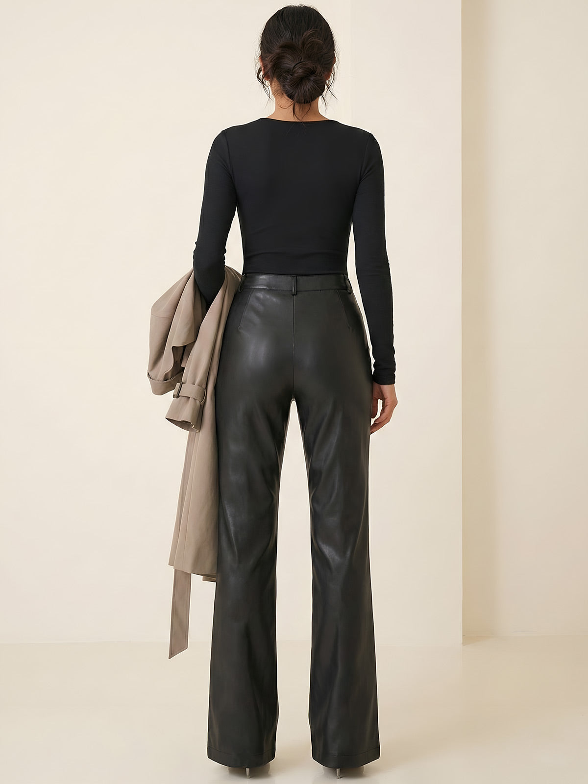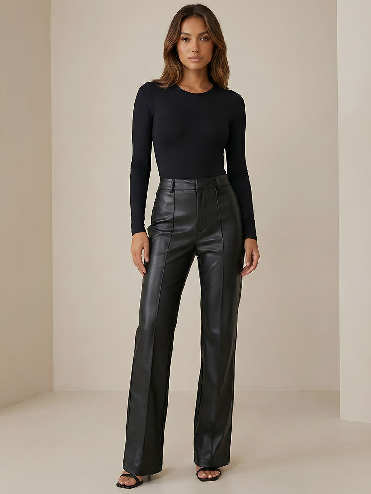 Noir Classic Leather Fit pants combine sleek faux leather construction with practical functionality. Featuring a straight-leg silhouette with a regular fit, these office-ready trousers offer subtle stretch for all-day comfort. Two side pockets and a distinctive back zipper pocket provide secure storage for essentials, while the flat front and zipper fly create a polished silhouette. Ideal for professional settings and casual outings alike.