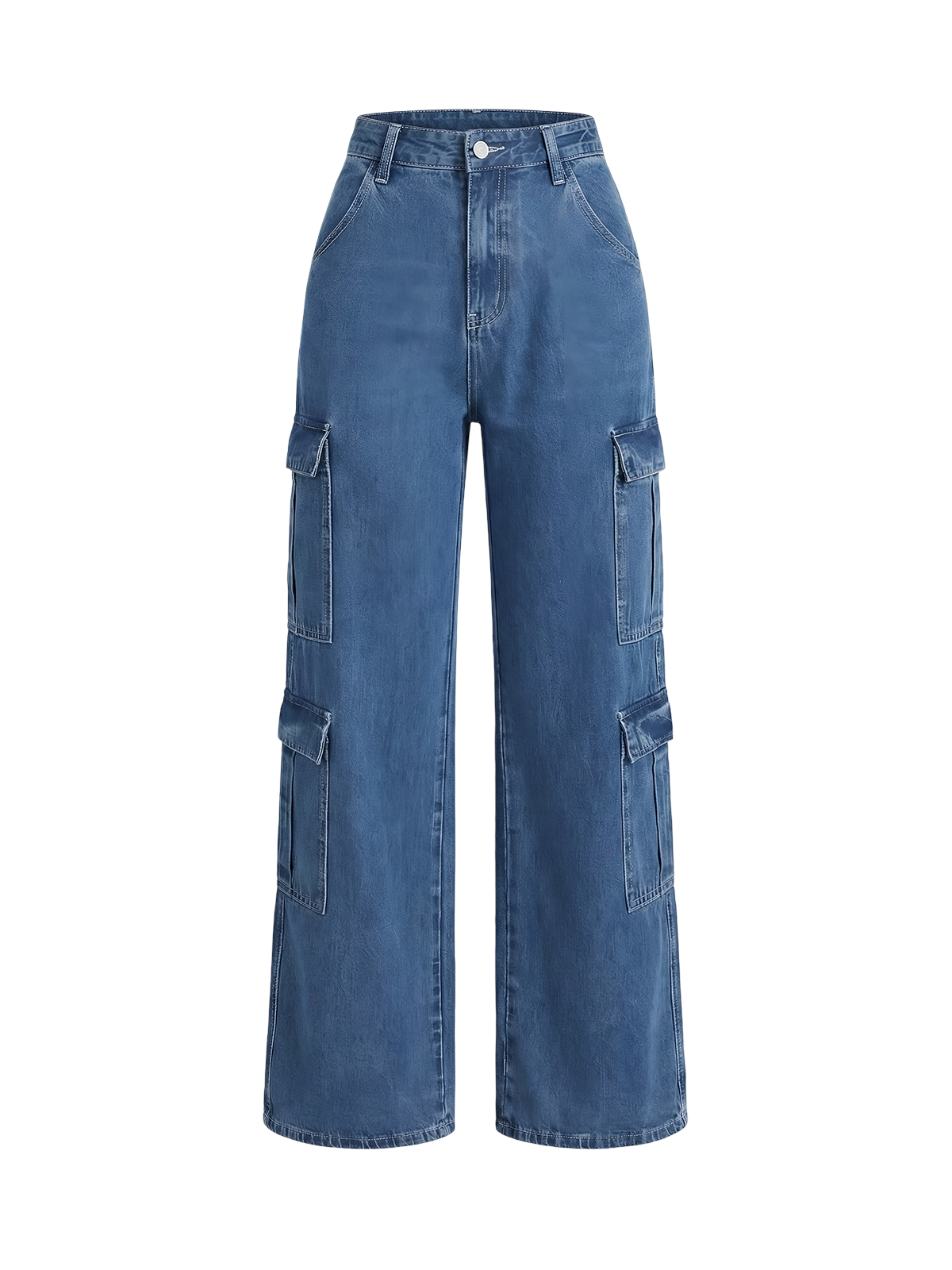 Denim Cargo Pants - Stay on-trend and comfortable with VESSITA'S Blue Y2K Denim Cargo Pants. Made for the modern woman, these high-waisted trousers feature a button pocket design and wide-leg silhouette for a casual yet sleek look. Elevate your style game with these fashion-forward cargo pants.