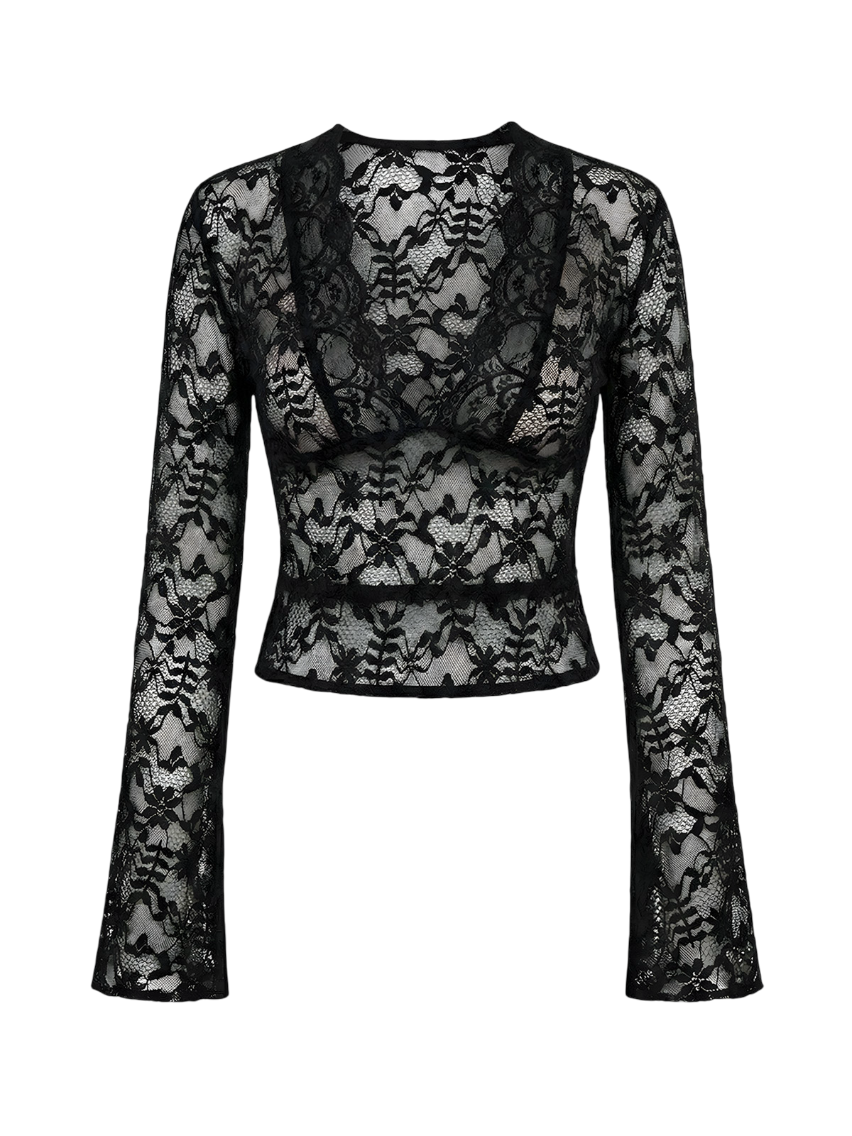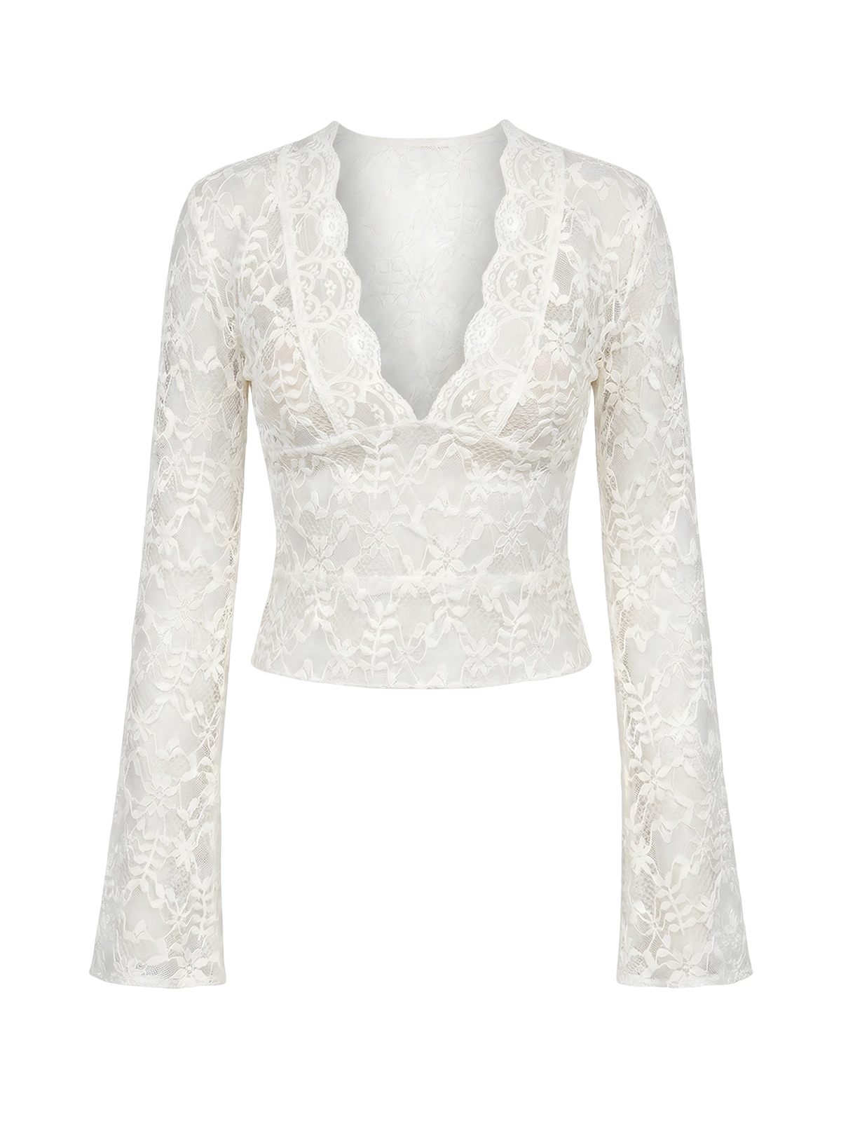 This VESSITA  Elegant Lace Sheer T-shirt is the perfect addition to your wardrobe. With a sexy V neck and flared long sleeves, it offers a slim fit that accentuates your curves. Made from high-quality materials, it provides both comfort and style. Perfect for vintage lovers and fashion trendsetters alike.