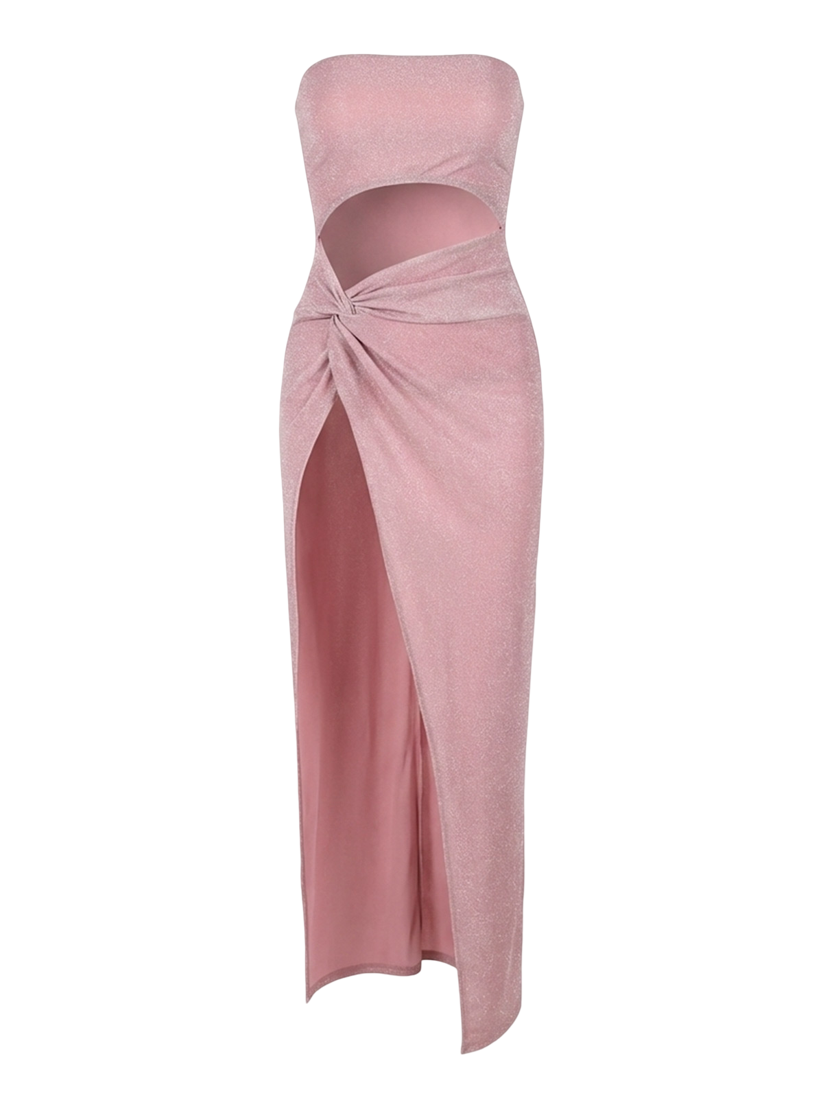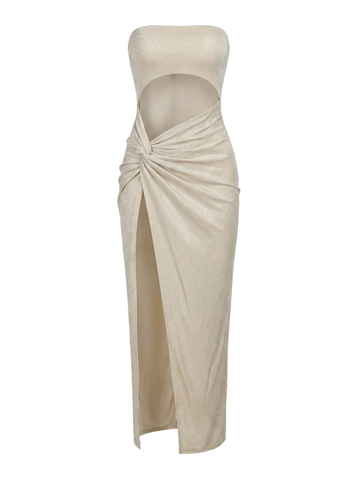 Sleek ankle-length dress in polyester-spandex knit with a body-hugging slim fit. Features a strapless chest-wrapping neckline, hollow-out detailing, and high stretch for comfort. Perfect for evening wear and club settings.