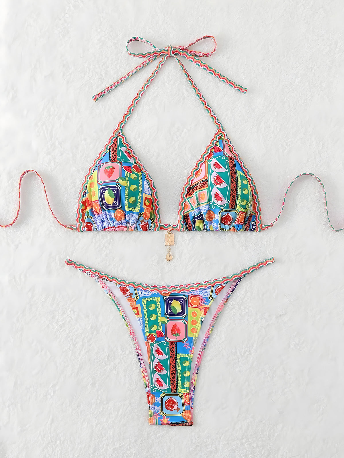 This sexy tropical print bikini set features a halter push-up bra designed to enhance shape and provide support. The matching thong bottoms offer a minimal coverage fit perfect for sunbathing and beach days. Crafted as micro swimwear, this biquini combines bold style with comfort, making it an excellent choice for summer holidays and poolside lounging. Its vibrant pattern and flattering cut highlight your figure while keeping you confident and stylish.