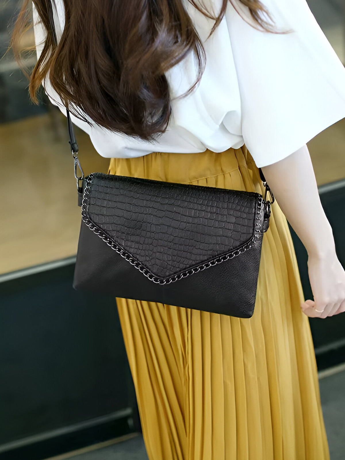 The Vivian-Black Edge Bag combines casual elegance with practical functionality. Crafted from soft PU material with a polyester lining, this envelope-style bag features multiple interior compartments including dedicated cell phone and zipper pockets for organised storage. An exterior silt pocket and chain decoration add contemporary appeal, while the cover closure ensures secure fastening. Versatile enough for everyday wear, this piece transitions seamlessly across occasions.