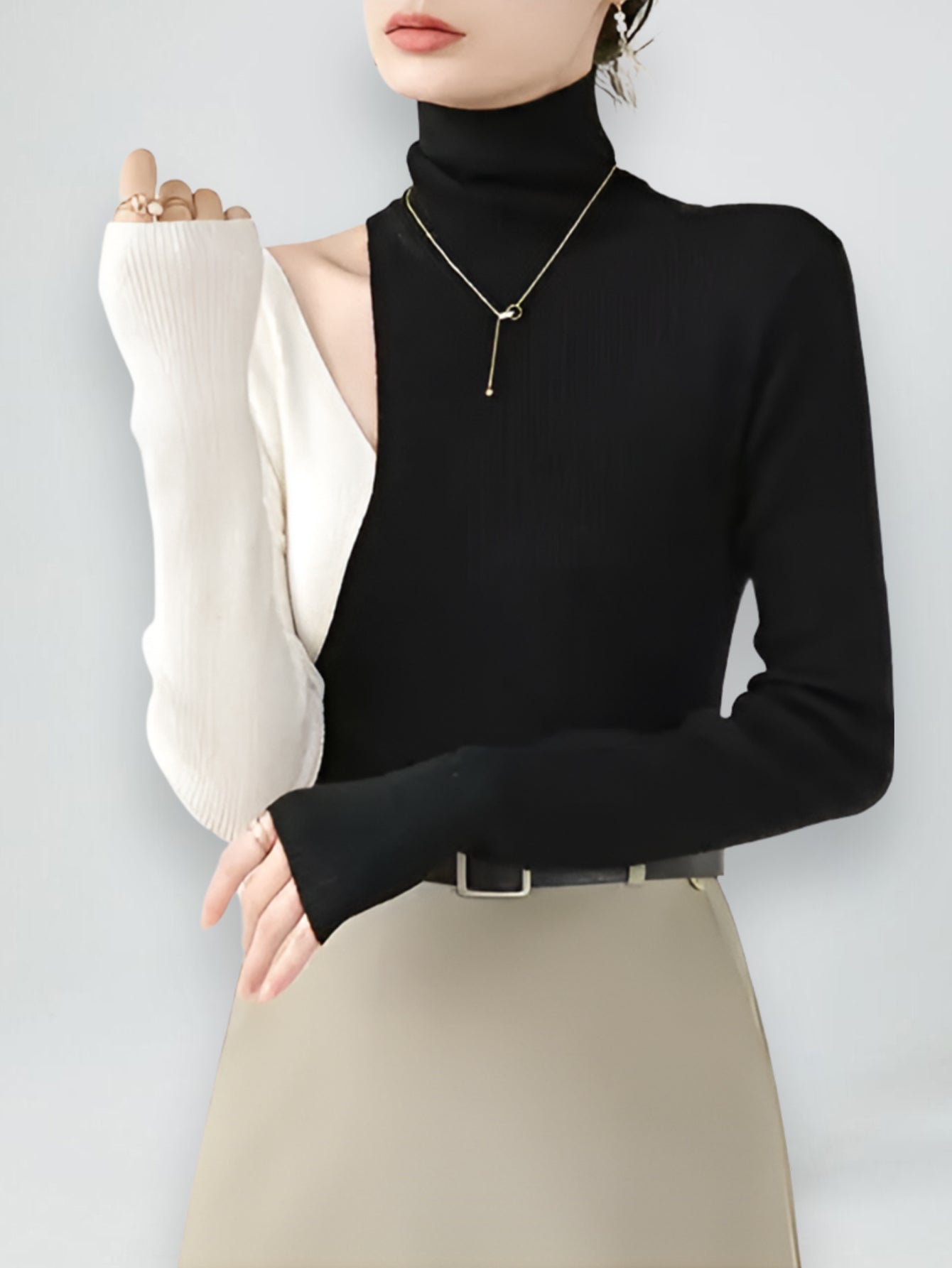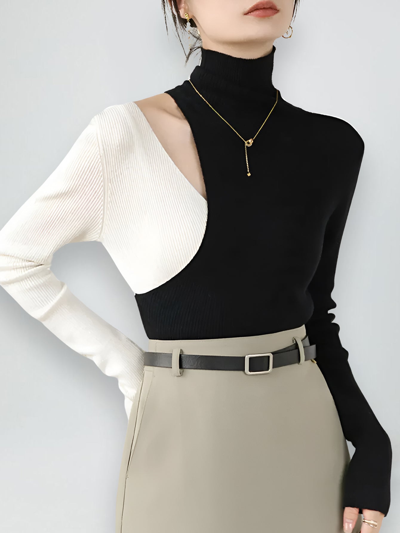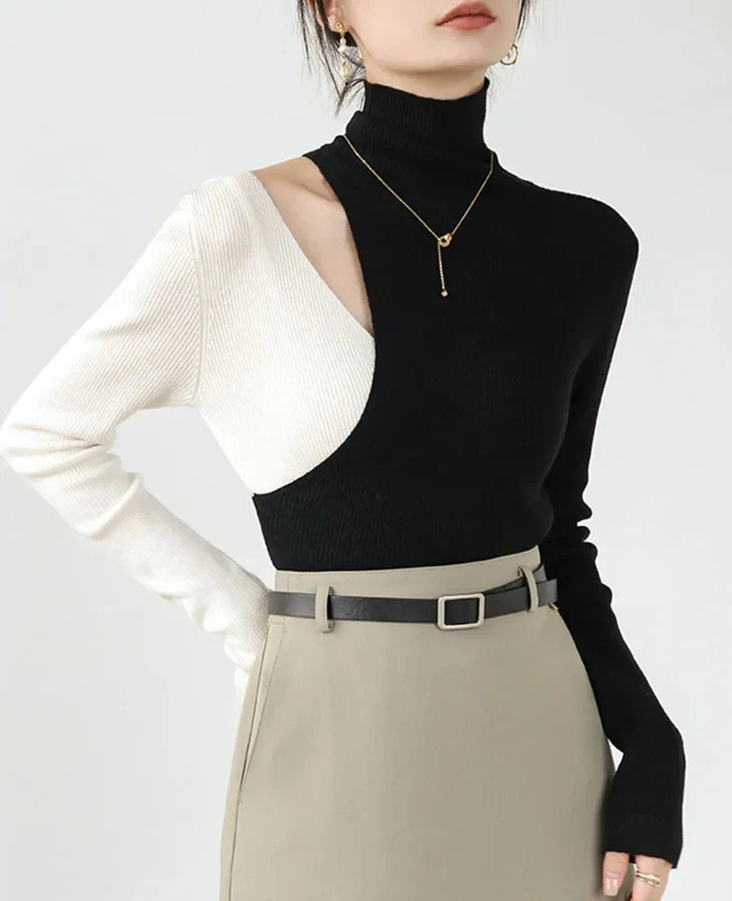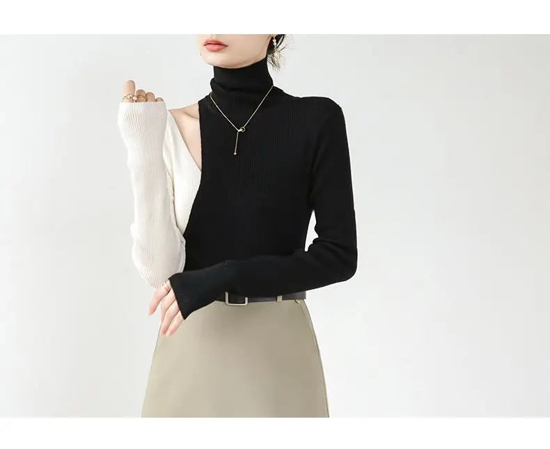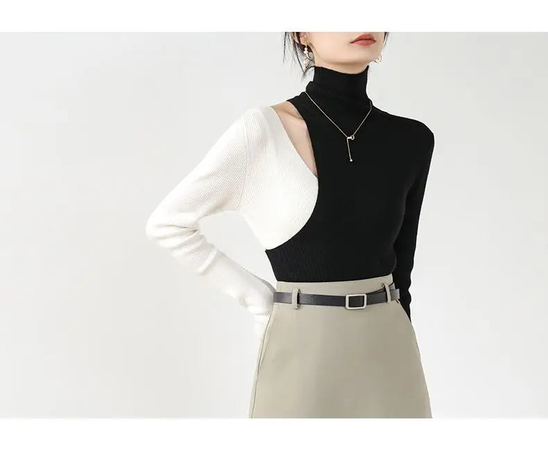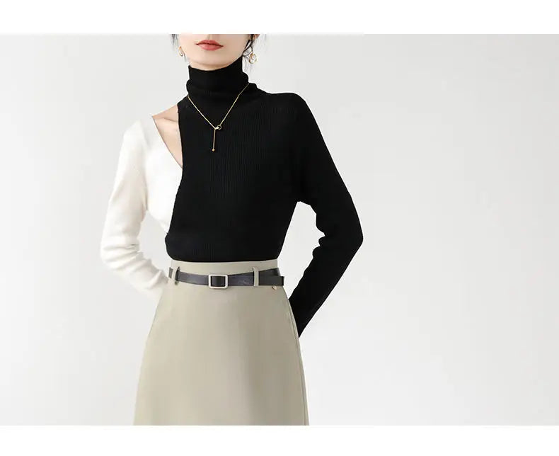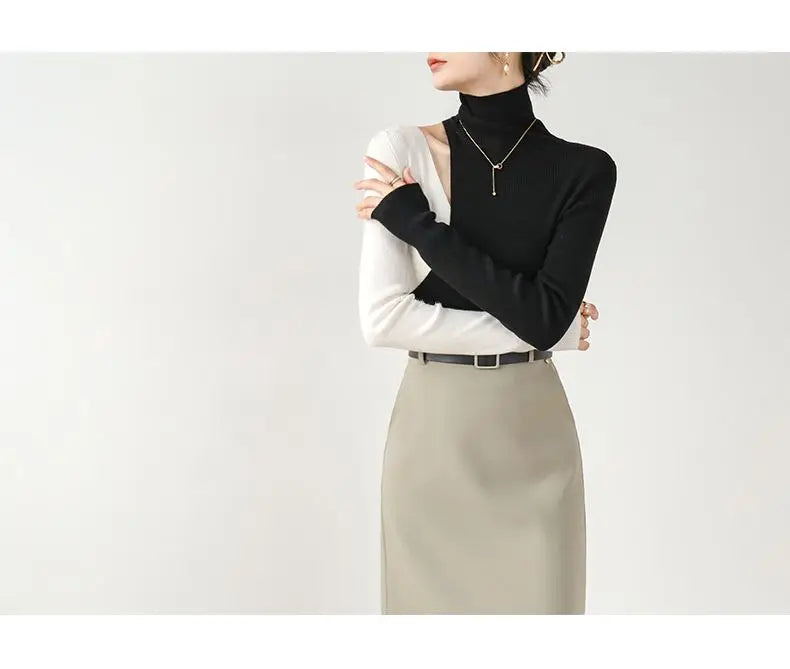VESSITA Winter Office Lady Women Bottoming Sweater Hollow Out Patchwork Knit Pullover Turtleneck Warm Female Clothing Tops